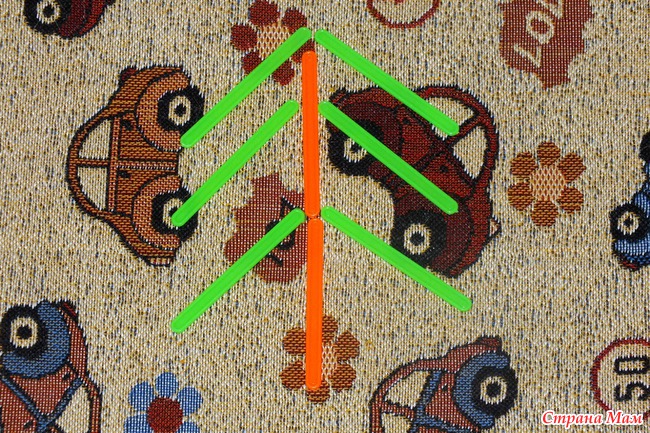Выложите из палочек ёлку (из двух палочек - ствол, из остальных - ветки, по 3 с каждой стороны). Прочитайте стишок: