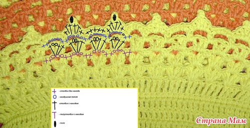 2-ряд- 3 в. п. подъема, далее вяжем ССН от середины спинки по всей длине юбки до середины спинки, не соединяя с началом ряда.