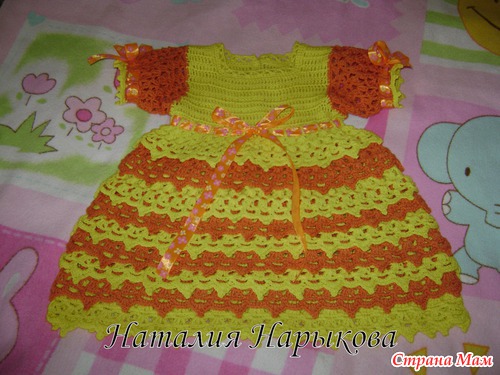 Пряжа Vita Soft Cotton 100%хлопок, 175м/50гр, цвета: лимонный №1803, оранжевый №1804, крючок 2,5 и 3, атласная лента 2,5 м, 3 пуговицы желтого цвета. На изделие понадобилось 950м пряжи.