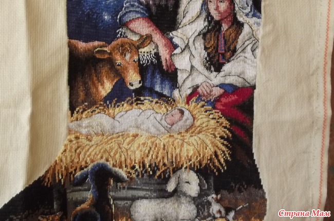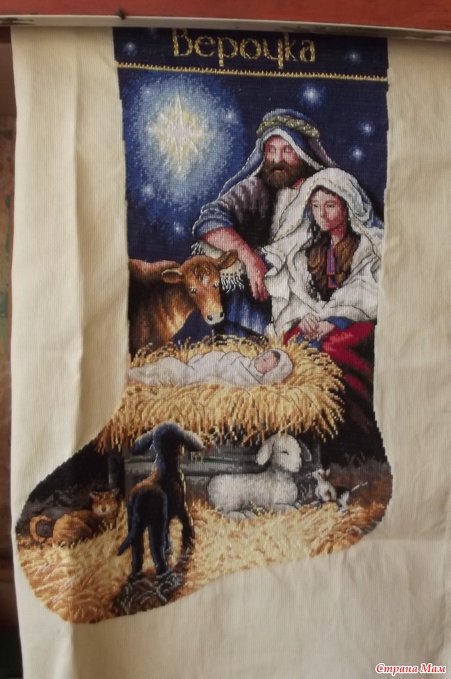 . Поэтому сапожок для племяницы начала еще летом - 25 июня. На этот дизайн обратила внимание сразу, когда увидела в первый раз, но наша семья не очень религиозна и дочкам шить такой сюжет мне не хотелось. Им больше подходят Дед Мороз, снеговик. А вот племяннице этот сюжет будет как раз в тему.