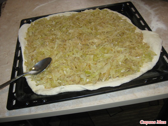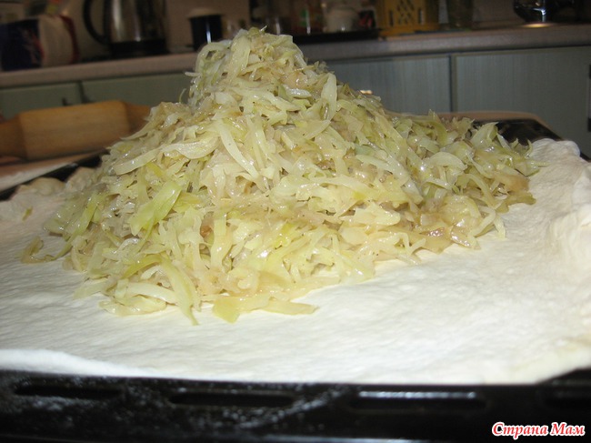 Накануне потушила 1вилок свежей капусты с луком, на растительном масле. Сегодня только выложила его на тесто!