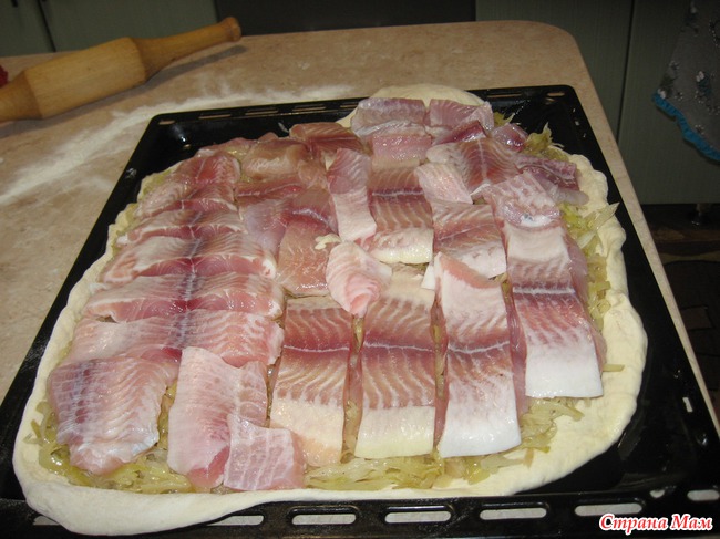 Сверху выложила рыбу! Я беру морской язык-филе, чтобы сочнее был пирог! И с костями не возиться!