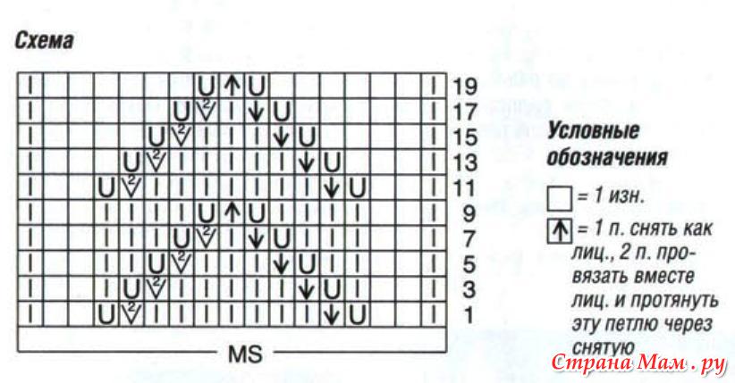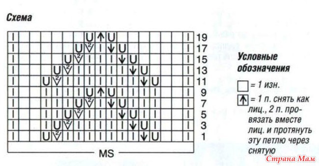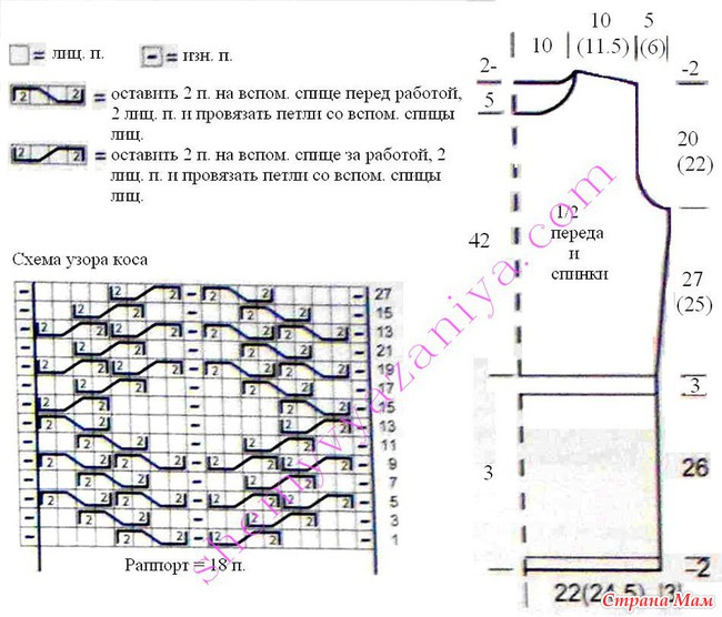 на вспом. спице перед роботой, 5 лиц. и провязать петли со вспом. спицы лиц); 17-й и 19-й р.: лиц. п.; 21-й р.: повторять раппорт с 1-го р.