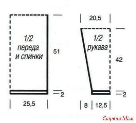 Для этого через 11 см от начала проймы закрыть средние 8 п. и в каждом 2-м р. 1 х 4 п., 1 х 3 п., х 2 п., 5 х 1 п.