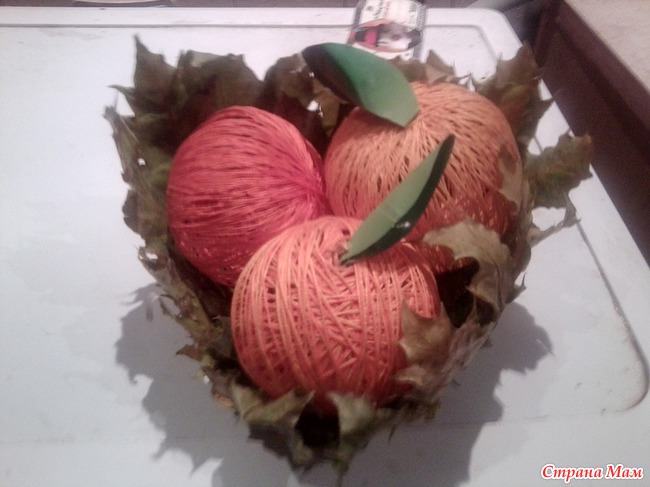 Это конечно наше совместное творчество с Егором и Матвеем. Вазу делали из кленовых листьев (тут можно посмотреть http://tridevici.com/vaza-iz-osennih-listev/ ) а внутри яблоки и апельсины из ниток