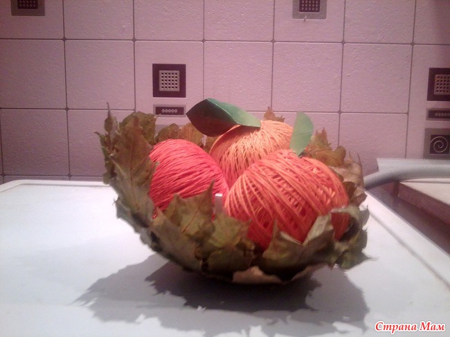 и выбрала вот чтоЭто конечно наше совместное творчество с Егором и Матвеем. Вазу делали из кленовых листьев (тут можно посмотреть http://tridevici.com/vaza-iz-osennih-listev/ ) а внутри яблоки и апельсины из ниток