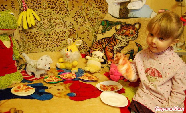 Делили пиццу, сначала посчитали игрушки, разрезали кусочки, всем дали.