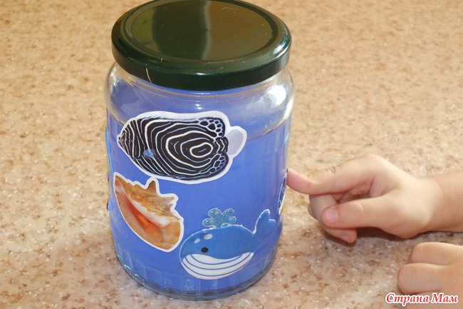 Сделали море в банке. Андрюше очень понравилось, показал вечером папе и бабушке. Очень гордился своей работой.