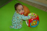 Кнопки нажимает, крышки закрывает, начал иногда пока-пока делать в ответ и где у мамы нос показывать, хватая его и засовывая резко указательный палец в ноздрю по самое не хочу и еще шевеля там(((( стеснительный стал, если человек незнакомый, то серьезный такой становится и голову мне на грудь кладет и прижимается ))) он обычно так не делает, а тут так нежненько и робко как бы прячется))