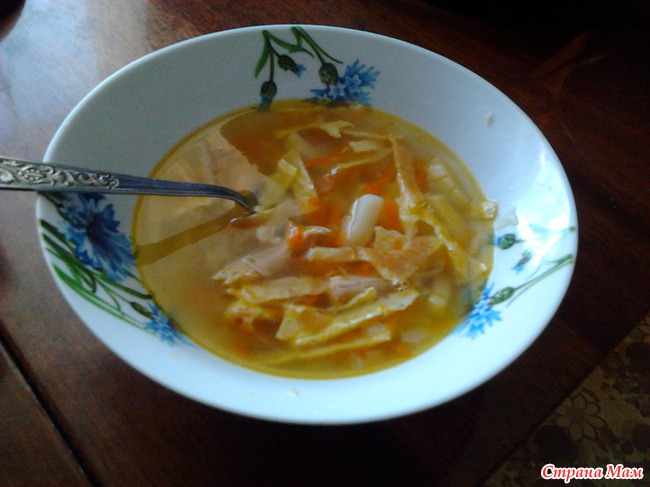 как суп готов достаём мясо и режем, яичные блинчики кладём в бульон потом и мясо и суп готов