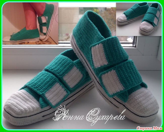 Связаны на подарок, размер 38, материал Nako Bambino, ушло примерно 1,5 зеленого и 1/3 мотка белого. подошва войлочная стелька, пришита мононитью (по моему смотрится аккуратнее чем пришитое шерстяной ниткой). застешки липучки. связано без схем на глаз, столбиками без накида