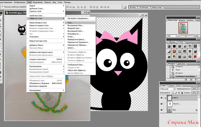 можно по желанию добавить тень. Сначала на котятах, в правом нижнем углу в графе слои должен быть выбран слой с котятами и выбираю функцию слои-тень