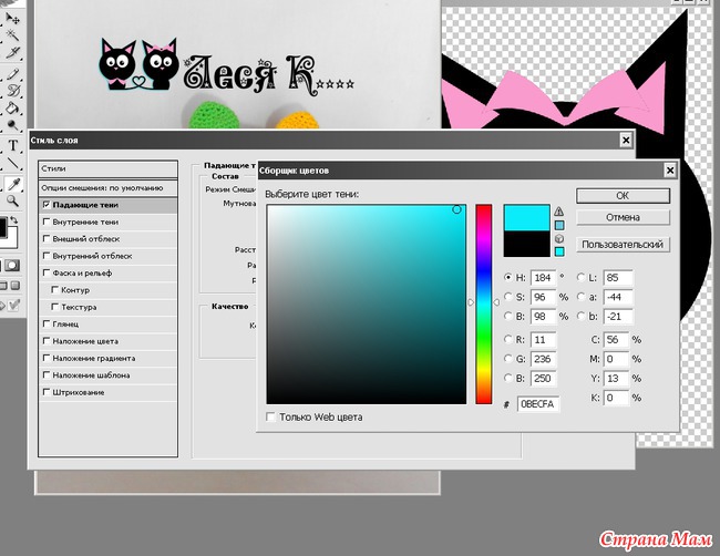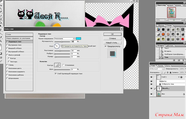 теперь выбираю опять в правом нижнем углу в графе слои "текст" и проделываю всё то же самое с тенью, так же на глаз, как понравится