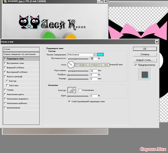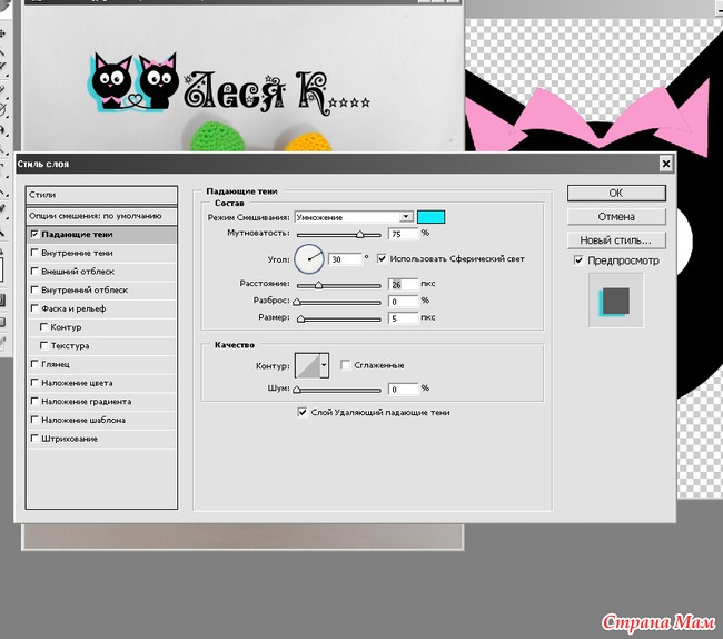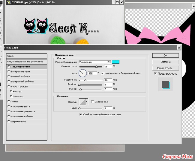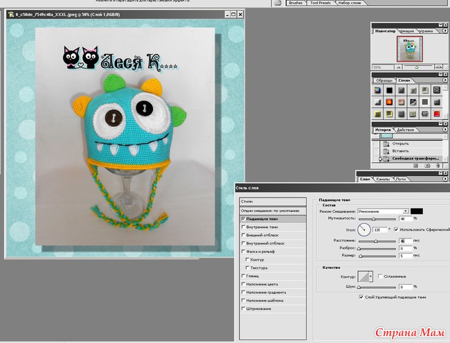 добавляю тени, всё то же самое делаю как с текстом и котиками, только не меняю цвет, получается эффект как будто фото парит