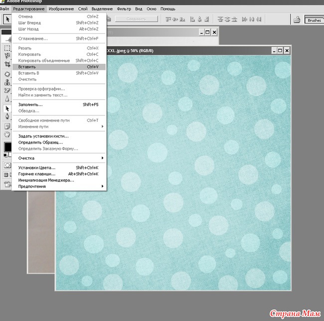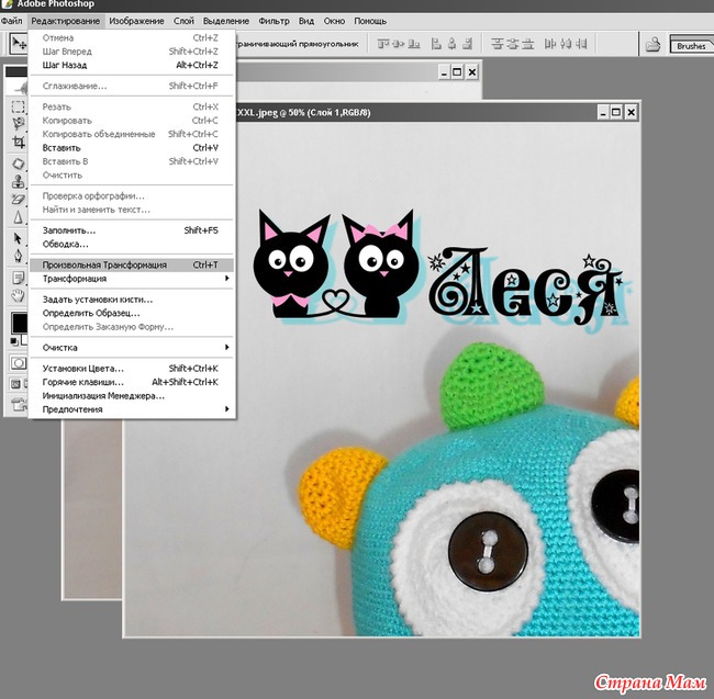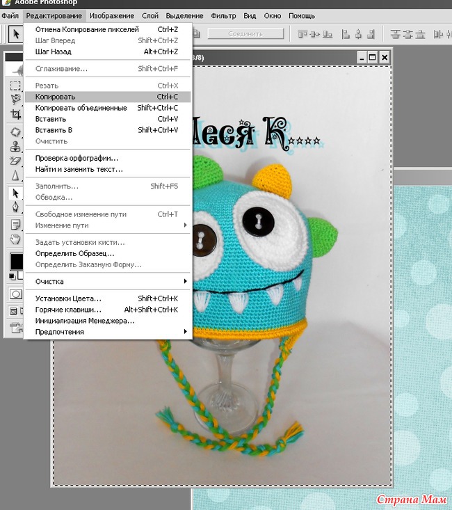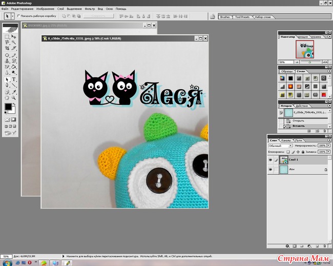 перед копированием моего фото, нужно объединить все слои (фото, текст, и котята). я забыла сделать скрин, поэтому словами, нажимаю слои в верхней панели, и выбираю объединить с видимым, и все слои соединяются в одно фото.