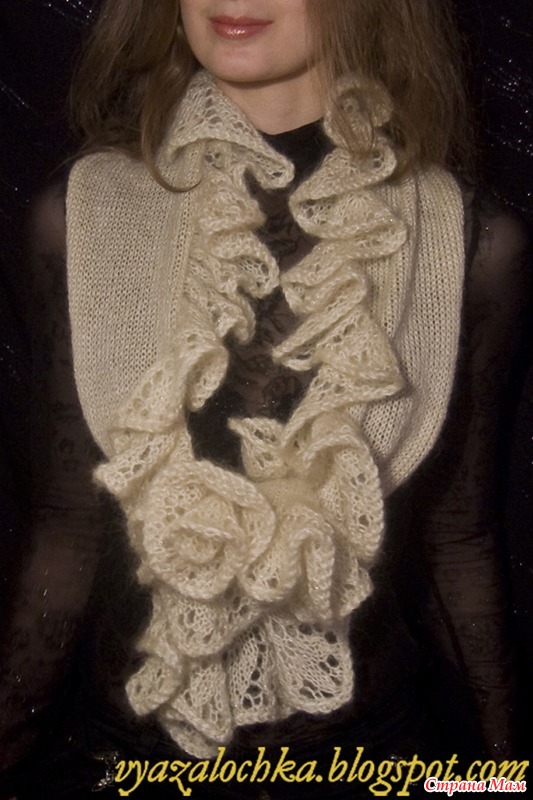 Цветок получается от скручивания "в трубочку" каймы короткой стороны шарфа (это делается за несколько секунд), при завязывании шарфа держится прекрасно и более ничем не фиксируется.