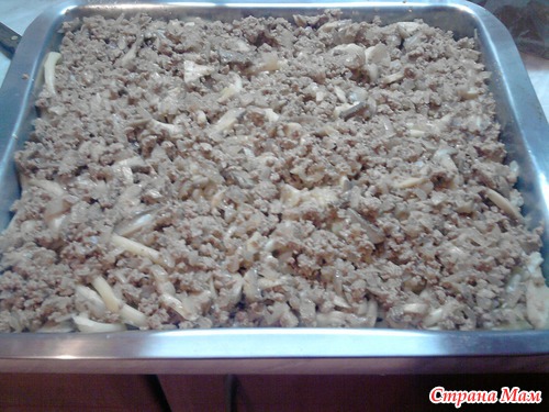 4. Выкладываем ровным слоем поверх макорон весь готовый фарш (покрыть полностью).