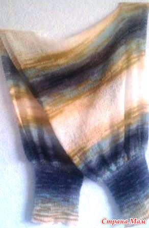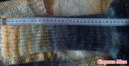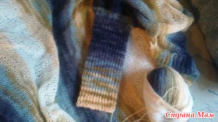 С рисунком не мудрила, чтобы не перегружать качество и расцветку пряжи: чулочным вязанием - основное полотно, а по краю пустила платочную вязку. Единственное: с практической точки зрения подобрала темную расцветку секций пряжи, одинаковую для обоих рукавов