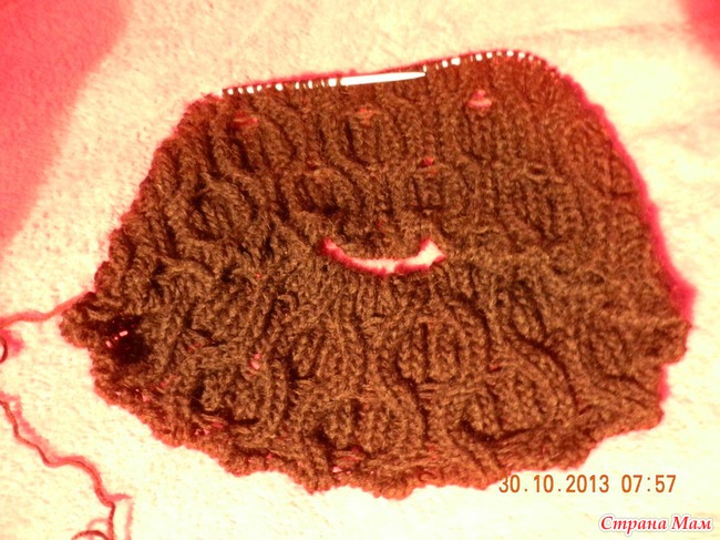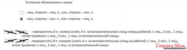 1-й круговой ряд: * первые 4 петли надеваем на вспом. спицу и оставляем её за вязанием. Далее провязываем след. 4 петли (1лиц., 2изн,1лиц), затем петли со вспом. спицы -1лиц., 2изн,1лиц ), следующие 4 петли надеваем на вспом. спицу и оставляем её перед вязанием. Далее провязываем след. 4 петли(1лиц., 2изн,1лиц), затем петли со вспом. спицы - 1лиц., 2изн,1лиц). Повторять от * до конца ряда.