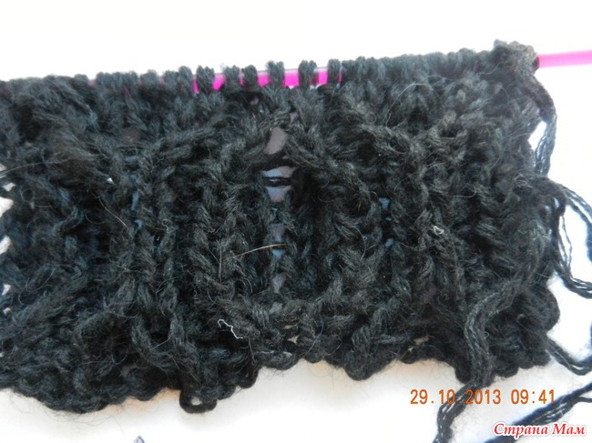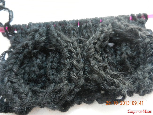 9 круговой ряд: * 4 петли надеваем на вспом. спицу и оставляем её перед вязанием. Далее провязываем след. 4 петли(1лиц., 2изн,1лиц), затем петли со вспом. спицы - 1лиц., 2изн,1лиц, 4 петли надеваем на вспом. спицу и оставляем её за вязанием. Далее провязываем след. 4 петли (1лиц., 2изн,1лиц), затем петли со вспом. спицы -1лиц., 2изн,1лиц ) Повторять от * до конца кругового ряда.