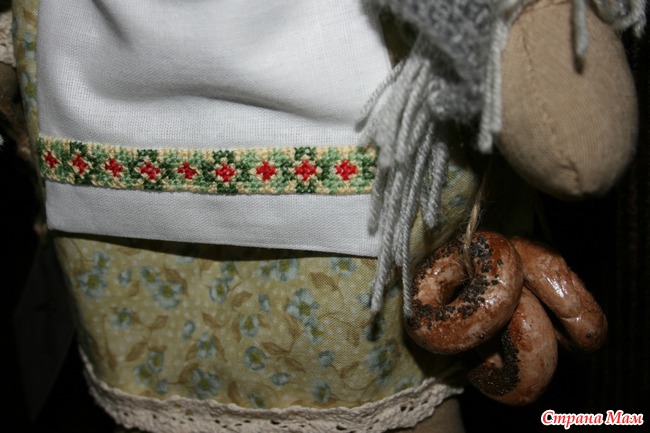 Тело изо льна. платье хлопок, фартучек из белой бязи с вышитым славянским орнаментом, шаль из шерсти, туфельки из драпа, бараночки из соленого теста.