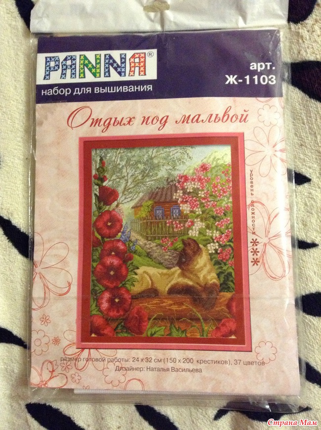 Увидела в инете кота как у мамы и сразу купила набор Панна Отдых в мальвах. Так руки и не дошли, все лежит, уж год как лежит и коту уже 1,5 года