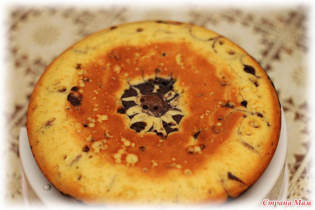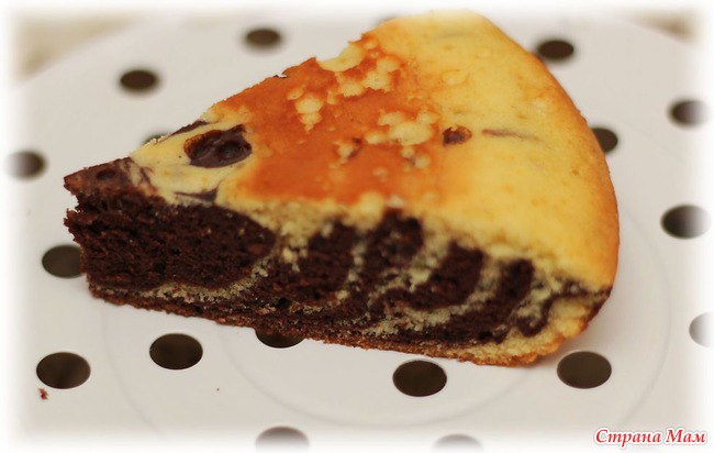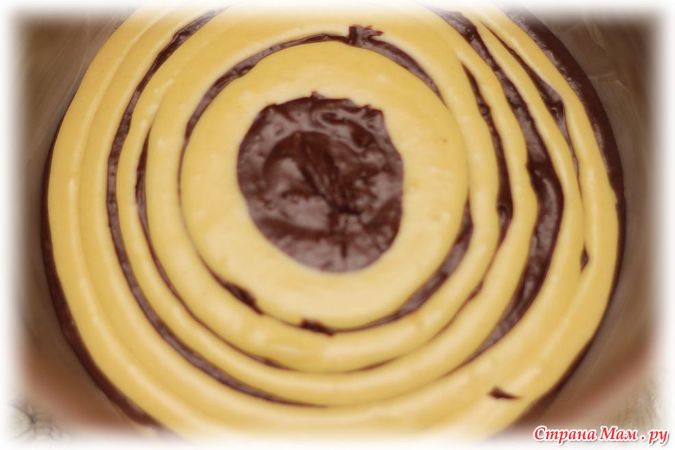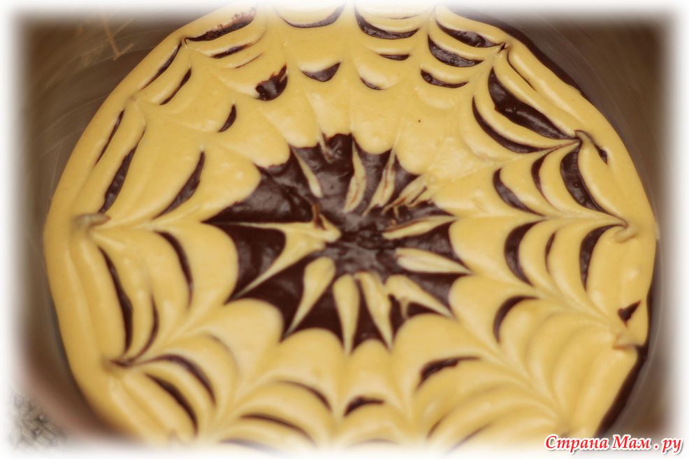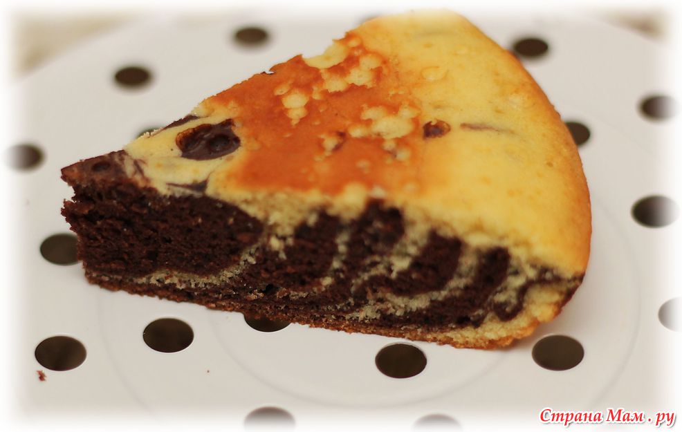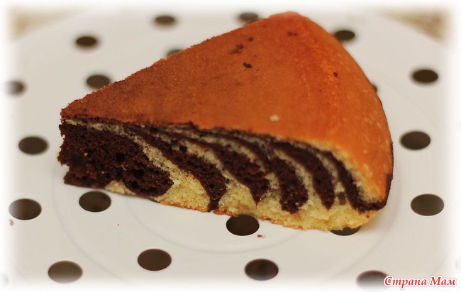 Яйца взбить с сахаром, добавить маргарин размешать(я все взбиваю миксером) муку смешать с разрыхлителем добавить к яйцам, щепотку соли все взбить, разделить на 2 части в одну добавить какао. Смазать чашу маслом и выкладывать по ложке светлое и темное тесто. Режим выпечка у меня спеклось за 35мин.