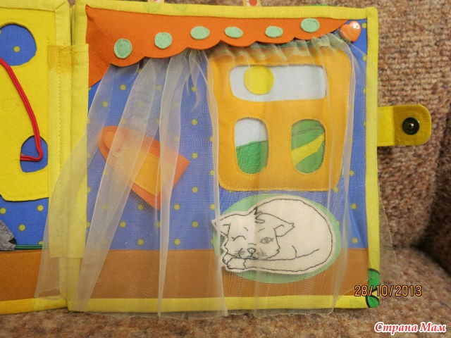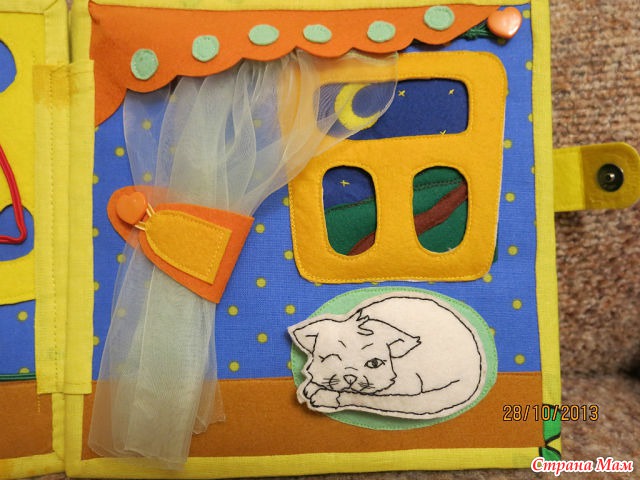 Котик на липучке, шторка на пуговке, за окном можно поменять пейзаж-день, ночь.