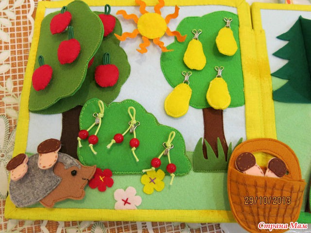 яблочки на кнопках, груши и вишенки на крючках. Ежик на липучке. Собирает запасы на зиму и несет в свою норку.