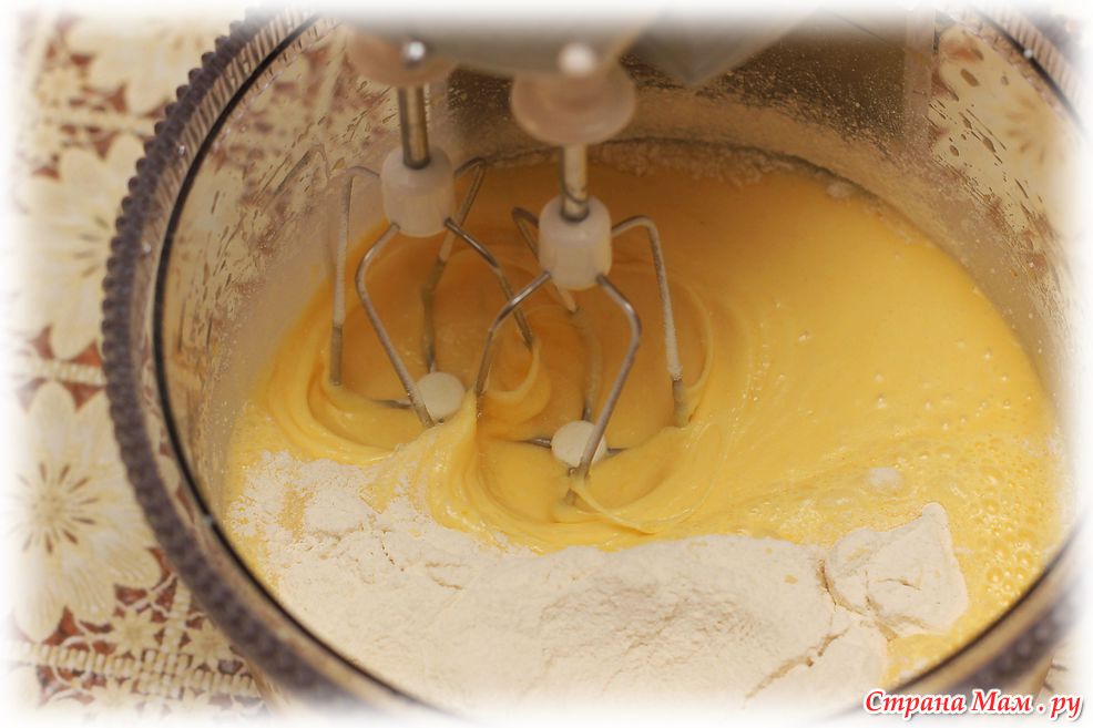 Затем добавляем муку, разрыхлитель взбиваем все