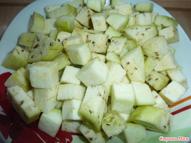 Для начала чистим баклажан, режем кубиками, солим и оставляем на 20-30 мин. чтоб не горчило, затем промываем водой и слегка отжимаем