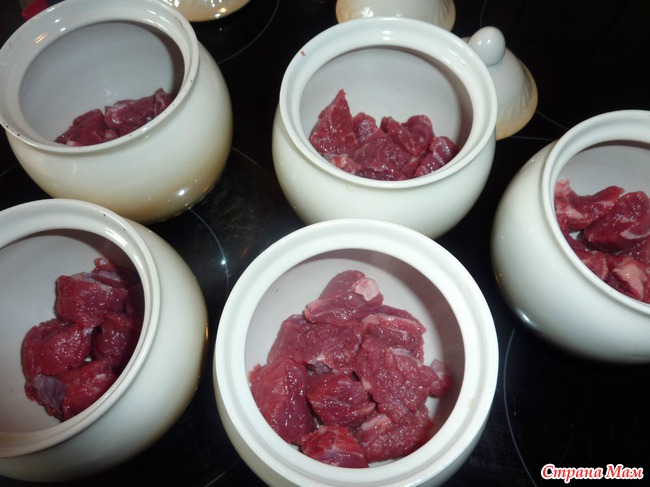 на дно горшочков выкладываем мясо