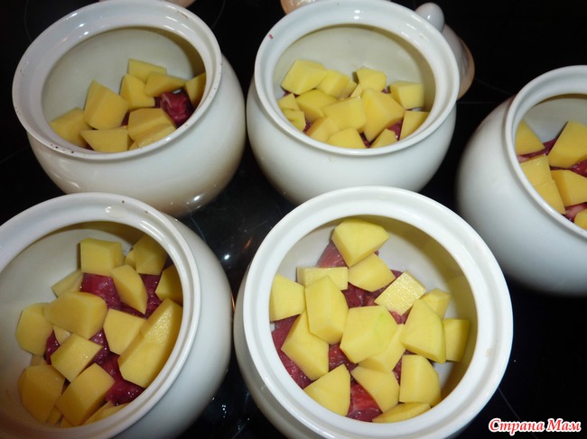 Картофель режем небольшими кубиками, выкладываем на мясо