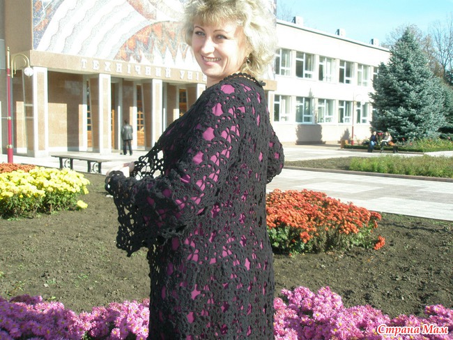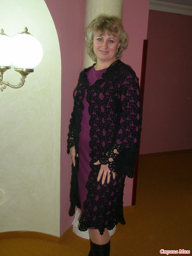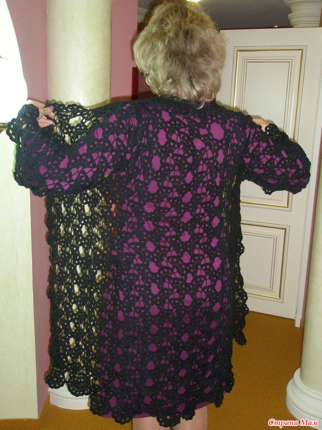 Кардиган (англ. cardigan) — вязаный шерстяной жакет по фигуре, без воротника, с глубоким вырезом, на пуговицах. Назван в честь седьмого графа Кардигана, которому приписывают изобретение данного предмета одежды с целью утепления форменного мундира. Как-то по фигуре не сидит, потому что из ленточного кружева, т. е. почти прямое. Пуговицы не пришиваю, ношу на "разлетайку".