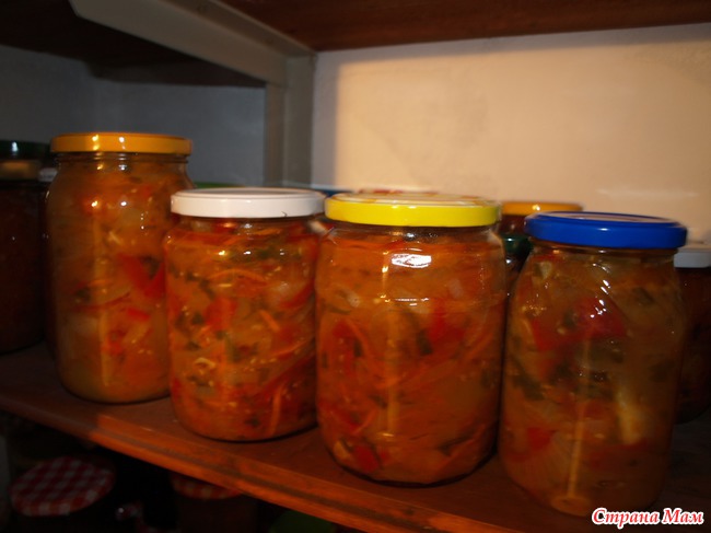 Выкладываем подготовленные овощи в эмалированную кастрюлю, добавляем соль, сахар, уксус и масло, перемешиваем и даем салату постоять 1 час, чтобы овощи пустили сок. Затем ставим кастрюлю на огонь и варим салат около 35- минут. Раскладываем салат в банки (баночки беру разнокалиберные- зависит от кол-ва едоков )) и закатываем. и под одеяло или шубу,((у кого, что имеется ))