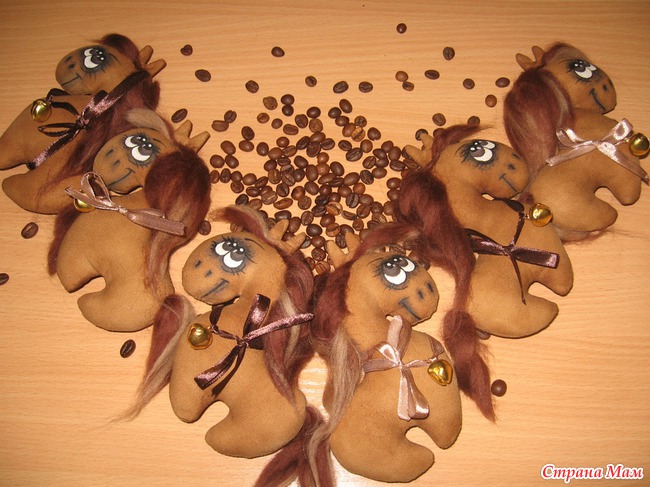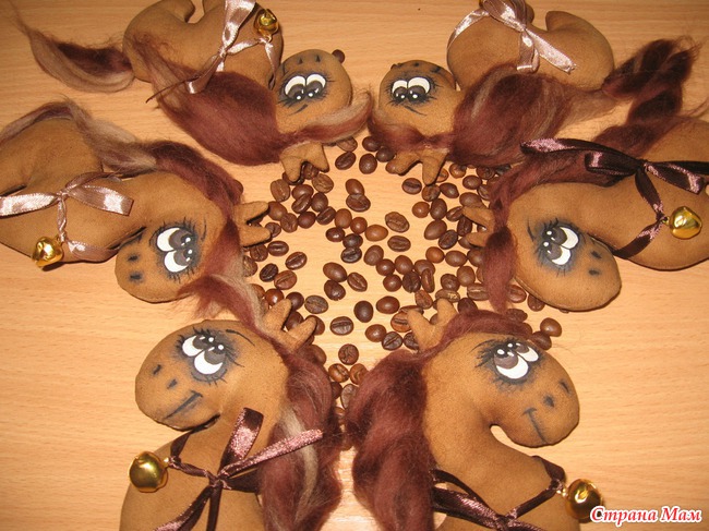 На заказ сшился табунчик кофейных лошадок, которыми заказчицей будут оподарены коллеги по работе.