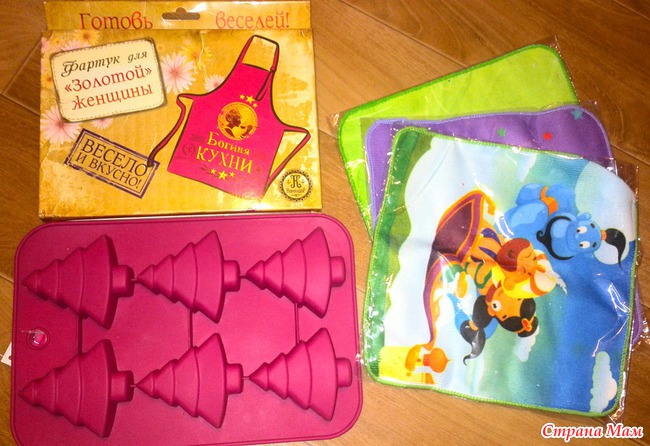 А теперь поподробнее. Эти богатства для меня: форма для выпечки (елочки и на Новый год пригодятся), салфеточки из фибры - очень люблю такие, и моя давняя хотелка - прикольный фартук