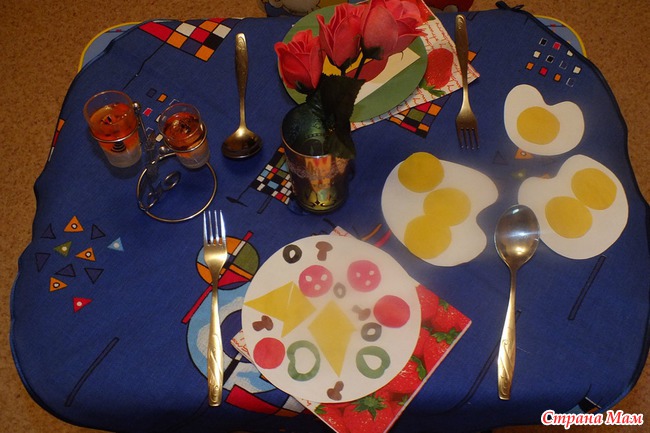 Накрыли на стол. Я выступала в роли официанта, а Андрюша - в роли посетителя. Было очень весело! Сфотографировать не получилось, не до этого было.