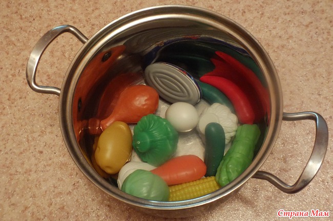 Дала ребенку 2 кастрюли. Должен был выбрать подходящие продукты и разложить по кастрюлькам. С супом проблем особых не возникло, только в нем, помимо курицы, оказалась баночка с рыбной консервой.