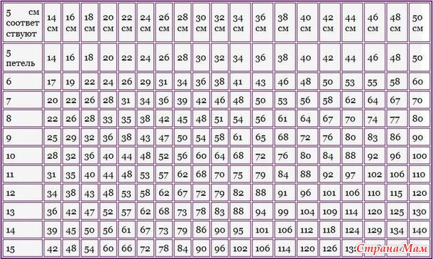 вычисляем сколько см на ОБ или ОГ у меня получается 55-56 см, теперь смотрим на эту табличку и вычисляем сколько петель нам надо на половину обхвата. По моим подсчетам у меня получилось 73 петли, я буду набирать 75) 73 +2 кромочные. Теперь распределяем узор что бы ножки у нас получились по середине. Вот схемка,