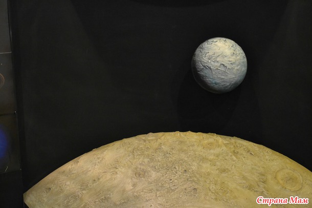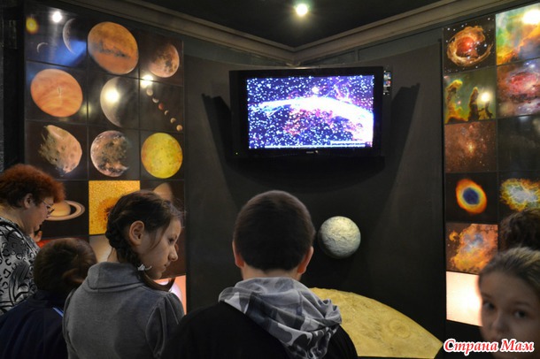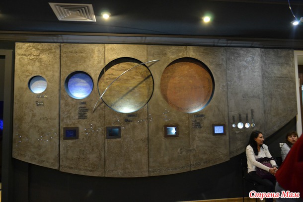 Первый зал – Космос. Здесь можно взвеситься на любой планете, а также на Солнце и на Луне, изучить планеты с их спутниками, понаблюдать за небесными телами в телескопе, нажать на кнопку и посмотреть, что изображено на картинке, покрутить земной шар с нанесённой картой звёздного неба. Тут мы застряли надолго