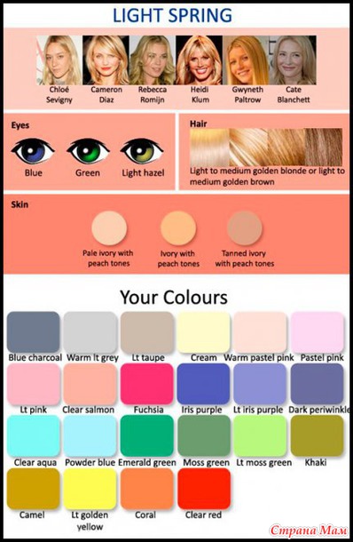 Итак, весна. Весна светлая, у весны чаще голубые и синие глаза, волосы – белые, светло-русые. И обязательно с золотинкой. Весна – самый светлый цветотип. И весне подходят такие же тёплые и светлые, как она сама, цвета – жёлтые, оранжевые, светло зелёные, ярко голубые, светло розовые. В одежде весне лучше выбирать однотипные чистые расцветки. В деловом (офисном) стиле весне подойдут простые фасоны, силуэты с чёткими линиями. А вот образ роковой женщины совсем не для весны, для него она слишком тёплая, тут придётся менять цвет волос, наносить яркий макияж (у весны часто очень не яркие от природы брови и ресницы), да и использовать линзы – глаза весны также не обладают достаточной холодностью, они слишком тёплые. Весне достаточно хорошо подходит спортивный стиль, а вот романтический стиль не её, ей также нужно избегать носить манерные вещи.