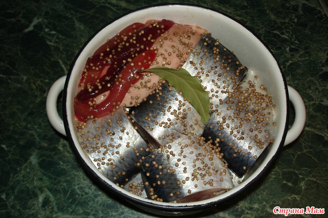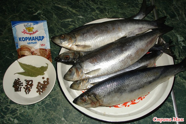 Рыбу складываем в эмалированную посуду слоями, пересыпая сухим кориандром. Если в рыбе встречалась икра или молоки, уложите их сверху, они будут готовы уже через сутки.