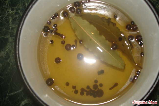 Готовим маринад. Все выше перечисленные специи, за исключением уксуса и кориандра, закладываем в кастрюльку, заливаем 0,5 литра воды, ставим на медленный огонь, доводим до кипения и кипятим 5 минут.