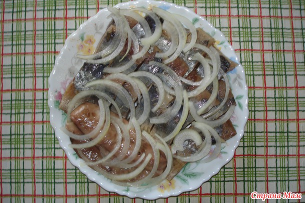 Через двое суток наша рыбка - готова! Ее можно использовать и в салаты, и в "шубу", и просто заправить луком и маслом. Если пойдет под заправку, для аромата, можно вместе с маслом, добавить ложку нашего маринада.