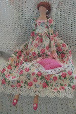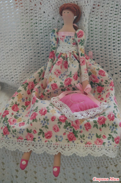 Эта куколка улетела в Россию и она уже у своей хозяйки. Хозяйку зовут Марина, поэтому на подушечке буква М.