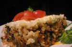 Половину обжаренных грибов с луком выложить в форму, на рис. Сверху, на грибы, выложить оставшийся рис и разровнять поверхность.