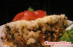 Половину обжаренных грибов с луком выложить в форму, на рис. Сверху, на грибы, выложить оставшийся рис и разровнять поверхность.