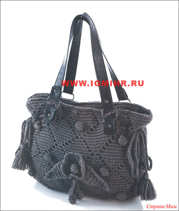 Вам потребуется: 400 г пряжи (100 % хлопок, 150 м х 100 г) серого цвета; 2 готовые кожаные ручки черного цвета и фурнитура для их крепления; застежка-молния; стеганная подкладочная ткань на синтепоне; крючок № 5.