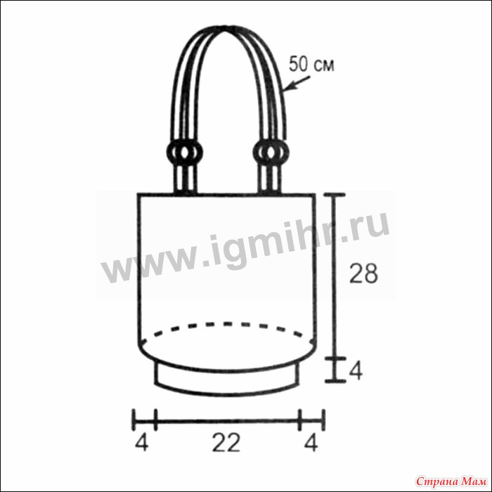 Набрать цепочку из возд. п. с учетом раппорта узора, замкнуть в кольцо и вязать по кругу, делая в начале ряда 1 возд. п. подъема, а в конце ряда соединительную петлю. На высоте 28 см от нижнего края разделить вязание на 2 части, отметив булавками условные границы боковых швов, отступить от этих границ с каждой стороны по 4 см и продолжить вязание на 2-х оставшихся средних участках (для донышка) на высоту 4 см. Сшить донышко, соединив нижние длинные края довязанных участков, затем соединить короткие отрезки с нижними открытыми участками основы сумки. От верхнего края сумки довязать подгибку высотой 3 см, подогнуть этот участок внутрь сумки и по линии сгиба выполнить обвязку ст. б/н. Вшить молнию. Сшить подкладку, вложить ее внутрь вязаной сумки. Пришить на машинке ручки, прокладывая строчку по периметру декоративных держателей для них.